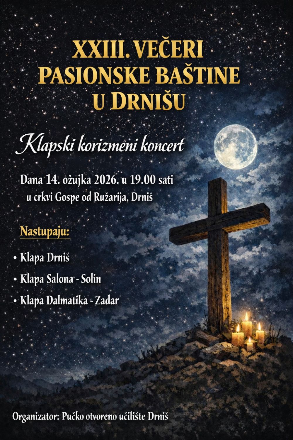 NAJAVA: XXIII. VEČERI PASIONSKE BAŠTINE U DRNIŠU - Klapski korizmeni koncert Napisano dana 10 Ožujak 2026. Objavljeno u Najave