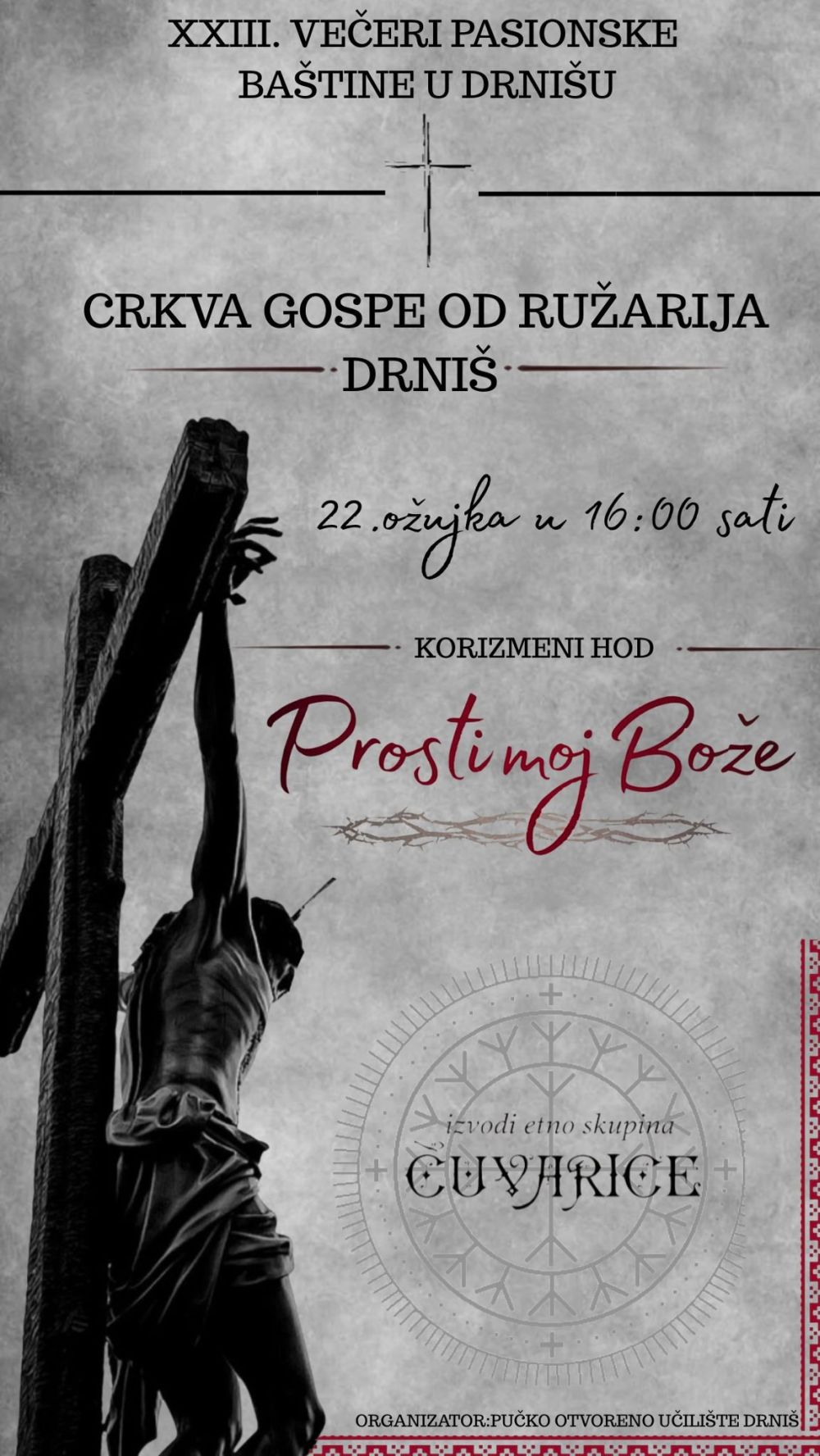 NAJAVA: XXIII. VEČERI PASIONSKE BAŠTINE U DRNIŠU - Korizmeni hod "PROSTI MOJ BOŽE" - etno skupina "Čuvarice" Napisano dana 10 Ožujak 2026. Objavljeno u Najave